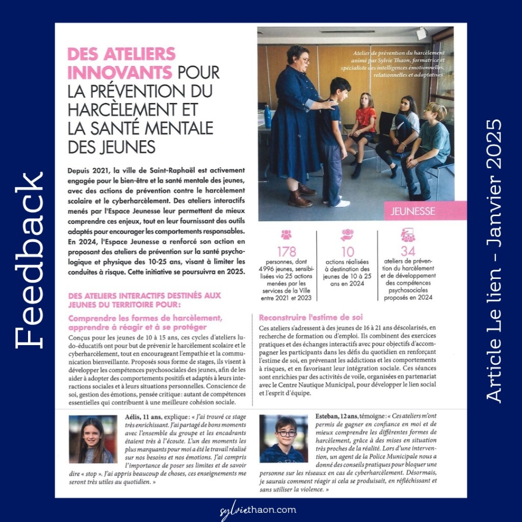Depuis plusieurs années, j’ai le privilège de travailler avec les collectivités et établissements scolaires de l’Est Var et de la Dracenie. Un partenariat s’est d’ailleurs construit avec l’Espace Jeunesse, la Médiathèque et la Mairie de Saint-Raphaël pour accompagner les jeunes de notre territoire. Ensemble, nous menons des actions concrètes pour répondre à des enjeux majeurs : prévenir le harcèlement, favoriser l’éducation émotionnelle et renforcer l’estime de soi.