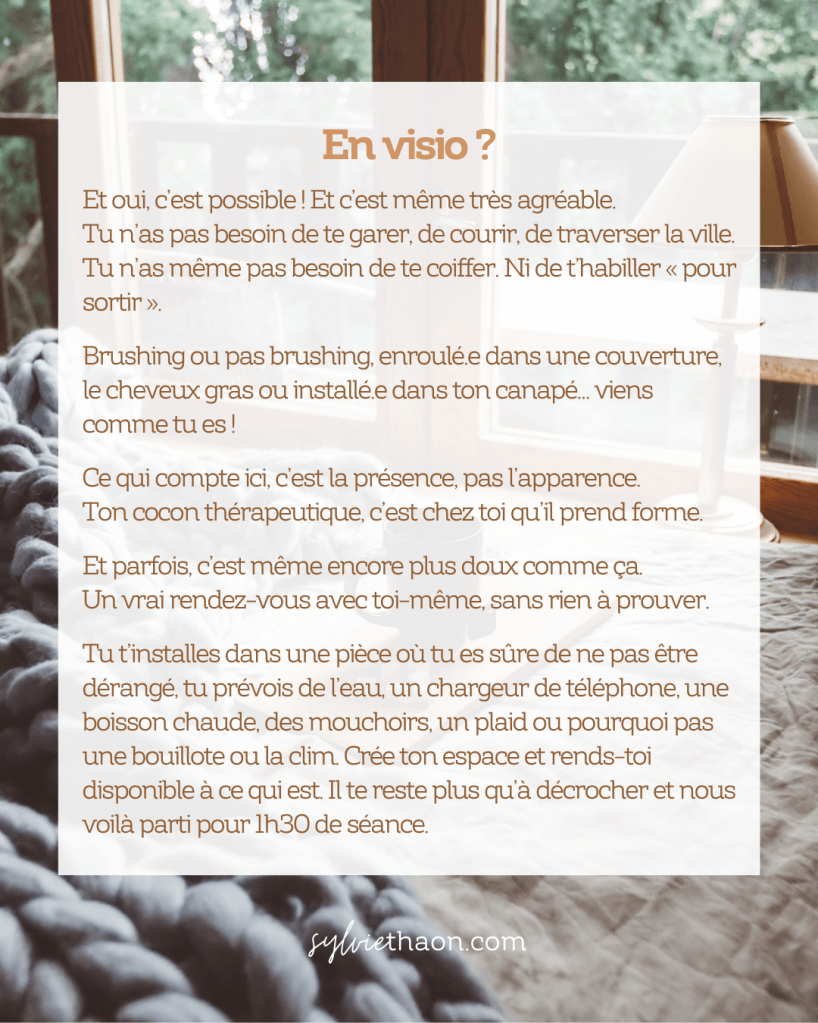 Ton cocon thérapeutique prend vie chez toi, dans ton espace, à ton rythme.